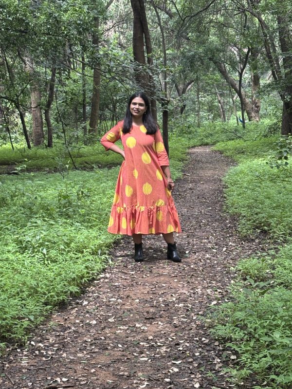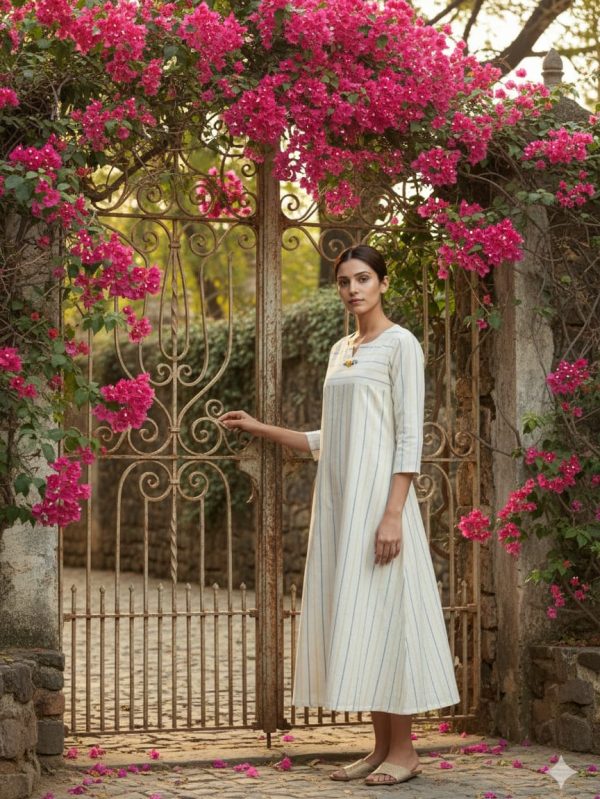 Crafted in pure hand-spun and hand-woven khadi, this dress celebrates the beauty of slow, sustainable craftsmanship. Made with 0% electricity consumption, every inch of the fabric carries the warmth of human touch and the essence of mindful creation.