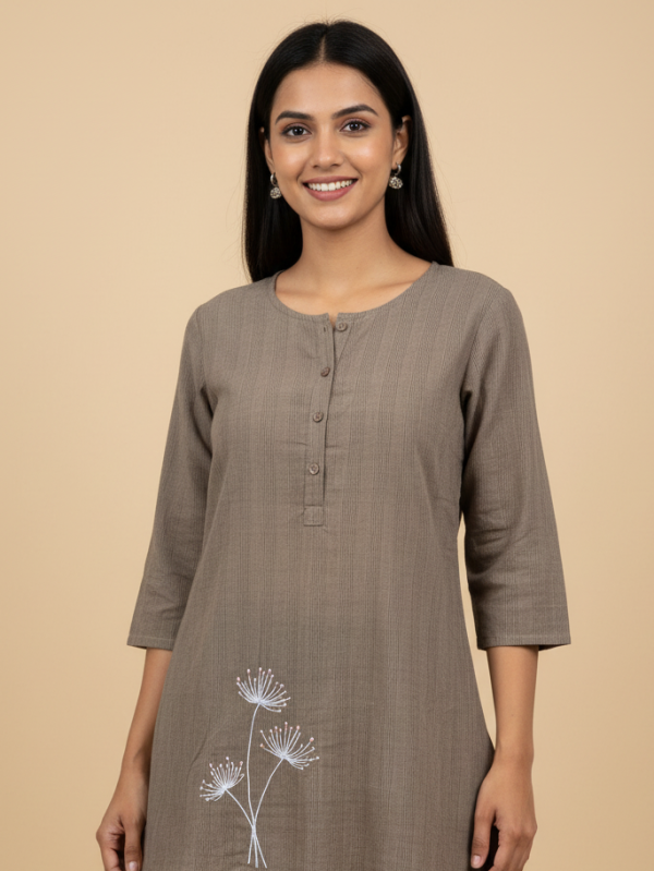 ₹1,199.00The komal phool khadi Tunic celebrates the beauty of slow fashion in an elegant palette. Woven by hand using traditional Malkha cotton (pure khadi), it offers unmatched comfort and breathability. Delicate hand embroidery of tiny flowers in cheerful yellow, white, and pink adds a playful contrast. Finished with a buttoned front and a unique high-low hemline, this tunic blends simplicity with thoughtful detailing—perfect for relaxed yet refined styling.