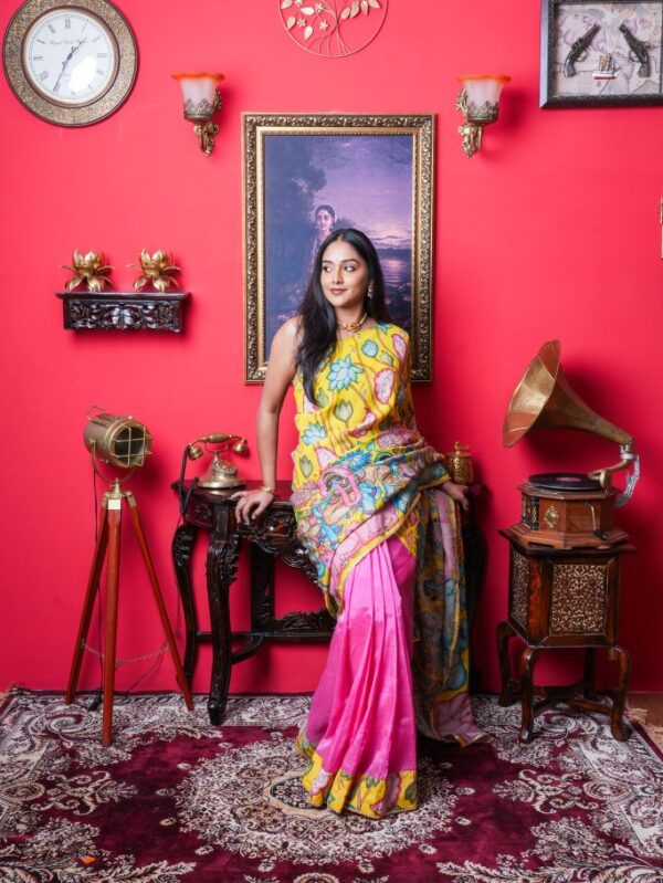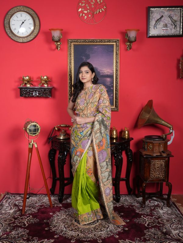 A majestic half-and-half saree blending handwoven Mangalagiri Pattu and hand-painted Kalamkari Chennuri silk, depicting Lord Rama’s coronation. A masterpiece of heritage craftsmanship.