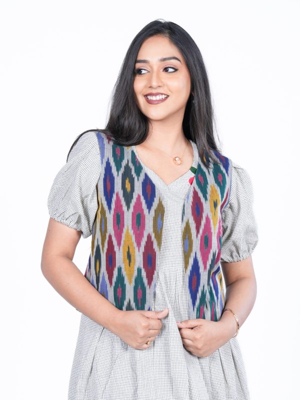 Wrap yourself in the artistry of double ikat with The Woven Mosaic Shrug. This exquisite piece celebrates traditional craftsmanship, meticulously handwoven with eco-friendly, azo-free dyes. The reversible design offers two distinct looks: a sophisticated grey and white weave on one side, and a vibrant grey with colorful geometric patterns on the other. Each thread tells a story, making this shrug a true work of art. Its breathability makes it perfect for summer, while its versatility allows it to elevate any outfit.